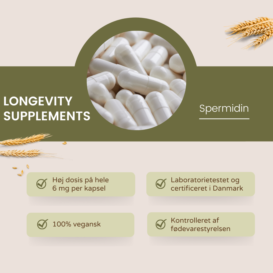 Omkring 30-års alderen begynder kroppens naturlig produktion af spermidin at falde. Derfor kan det være yderst relevant at supplere med vores kosttilskud.